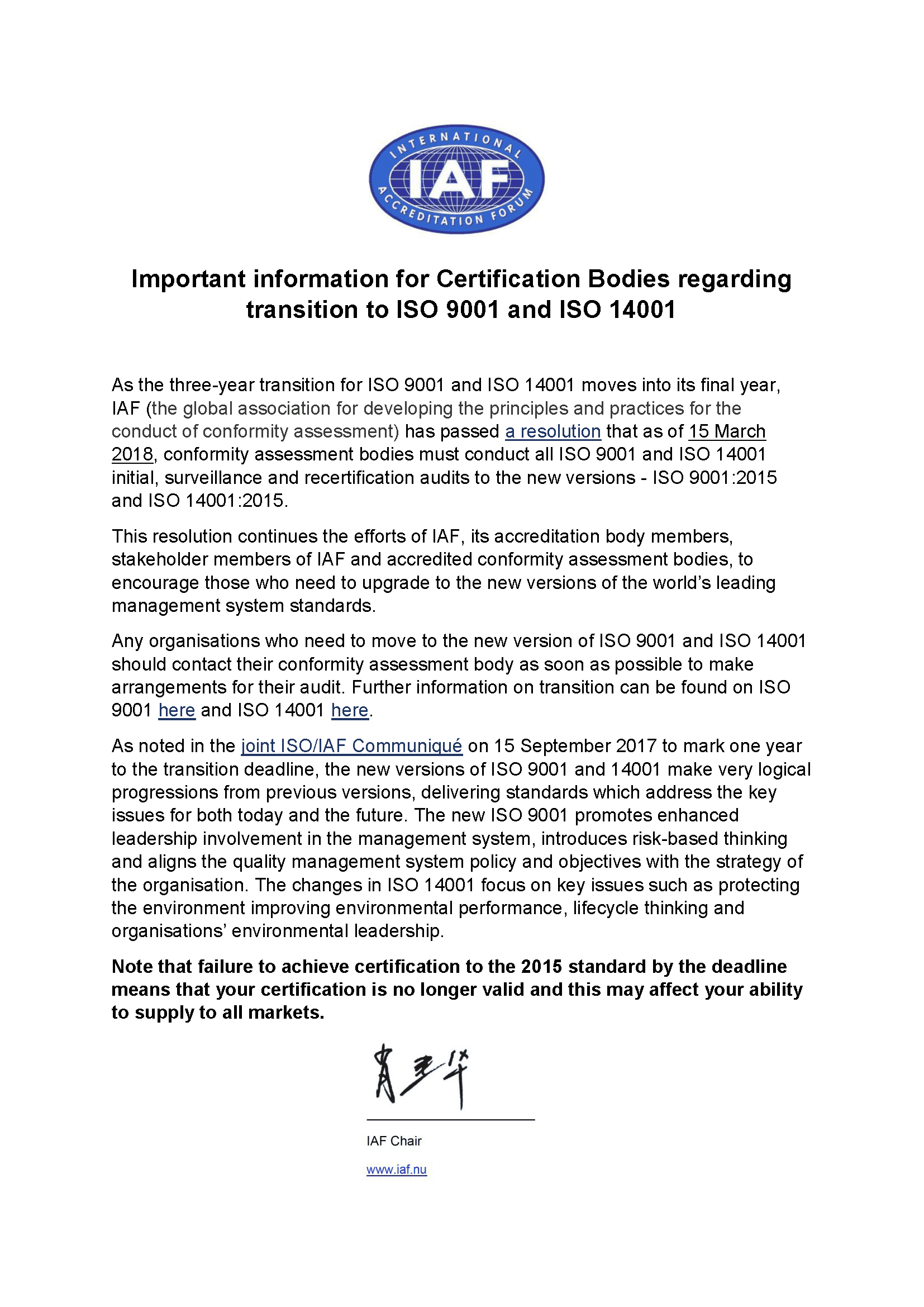 IAF官網(wǎng)發(fā)布了《對認證機構實施ISO 9001:2015及ISO 14001:2015轉(zhuǎn)版認證的重要通告》。要求自2018年的3月15日起,認證機構對實施的所有ISO 9001及ISO 14001認證必須按新版執(zhí)行,包括初次審核、監(jiān)督審核及換證審核。